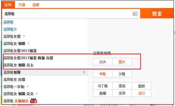 这些词是热词么?当然是热词,否则淘宝的下拉框中也不会推荐这些词,尤其是那些带颜色的词,比如说“圆头”、“单鞋”、“浅口”等等。并且消费者在点击这些词的时候,后台还会进一步增加这些词的搜索指数。